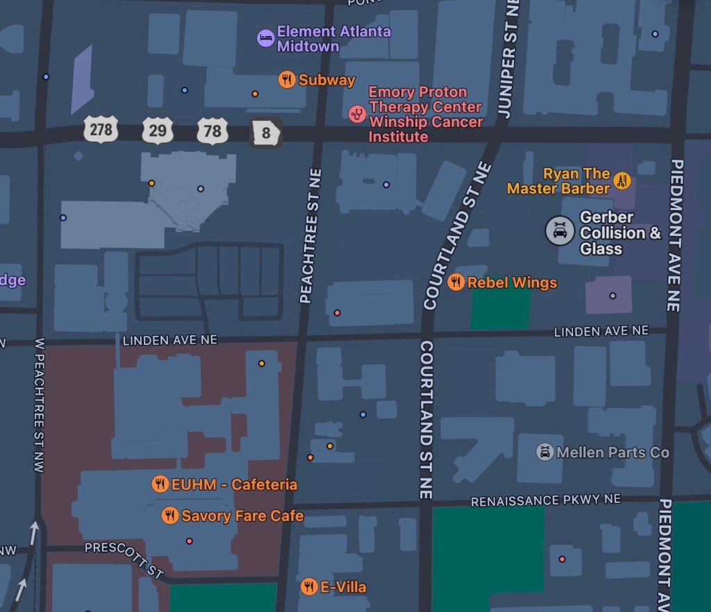 For those unfamiliar with the map above, you are looking at downtown Atlanta. EUHM is short for the Emory Hospital; 278, 29, 78 & 8 equals North Avenue, the Fox Theater is two blocks north on Peachtree Street and the big object that you can’t see between the numbers and Linden looms large in every photo posted by my owner.
