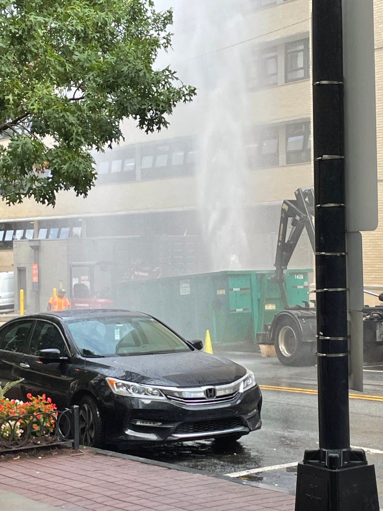 He walked out, noticing he would get drenched if attempting to open the door. This clearly wasn’t planned, since others stopped and took pictures and video. He went across the street to the Dunkin’ Donuts visible from my location. I saw both Dunkin’ employee exit the store to take a look at the gusher. The second was his attendant and although he ‘AirDrop’ed the video to her, she didn’t fully blend his frozen coffee and he brooded about that and if this is what “this generation” does now, feeling old and making me sense the age in my short six years of existence.